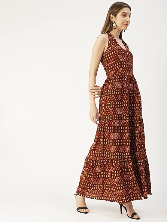 • Features: deep halter neck, sleeveless, front buttoned, high waist, flared bottom, lightweight and all over printed pattern